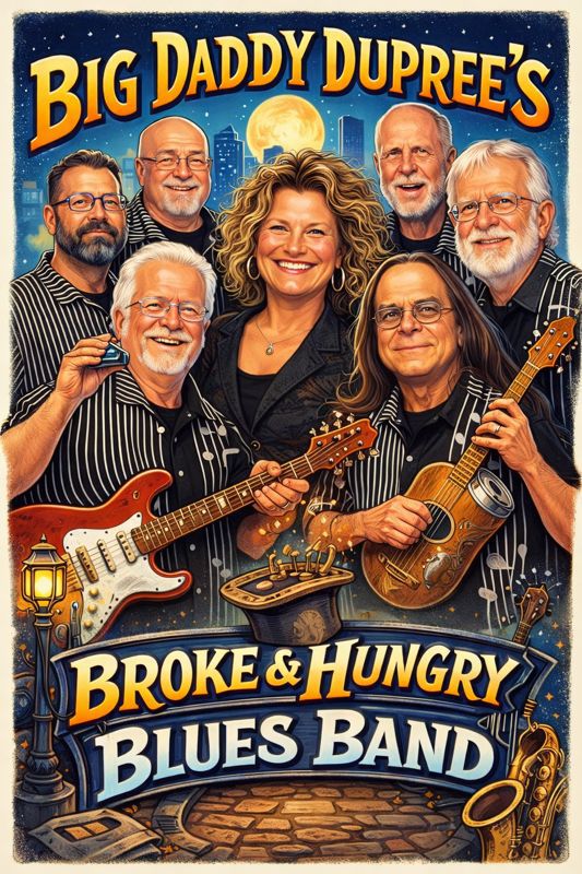 Booking Information: We are available to play for any occasion: weddings, birthdays, bar-b-que’s, reunions, tailgating, anywhere people just want to have fun! Weather permitting, we enjoy playing festivals and outdoor venues. We have a complete 5,200 watt pro sound and lights PA system. Big Daddy Dupree's Broke and Hungry Blues Band is a low maintenance band of true professionals that will be on-time, keep breaks to 20 minutes, stay sober, entertain the crowd, and clean up after ourselves when the show is completed.